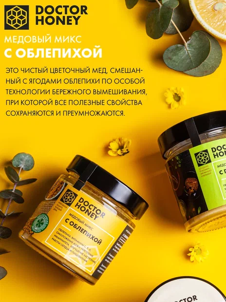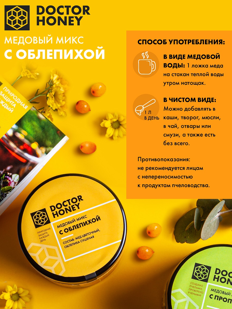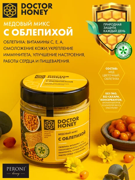 Состав: Мед натуральный цветочный, облепиха сушеная.